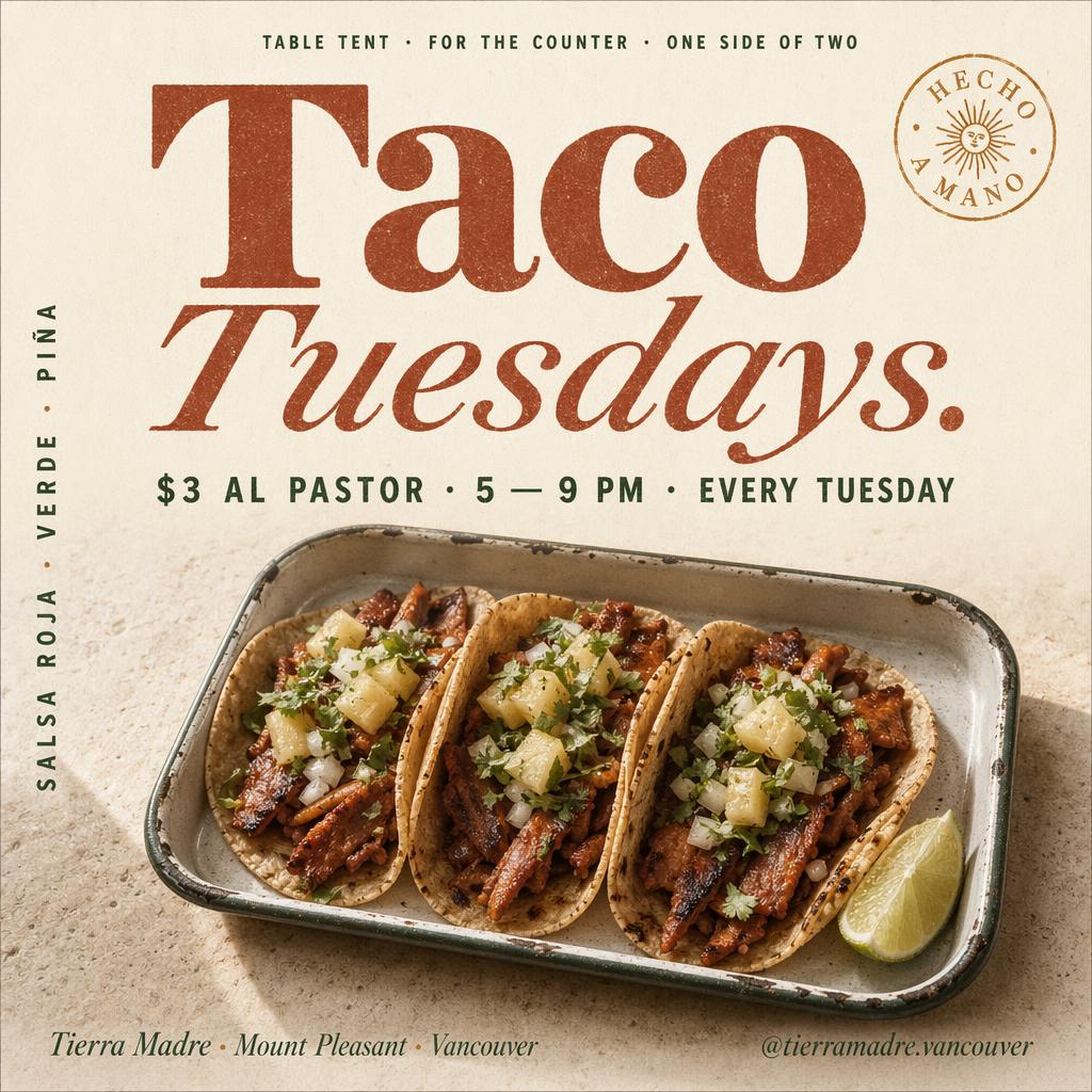 Every Monday, a full week of posts, flyers, and more lands in your inbox — ready in your voice. Made locally in Vancouver. $20 a month.
